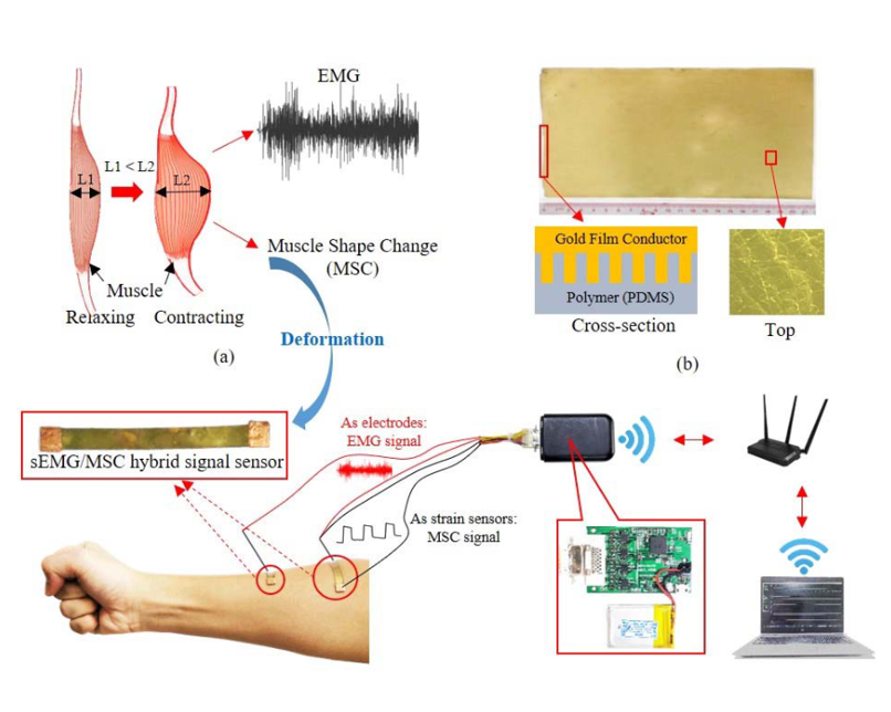 In-Situ Measuring sEMG and Muscle Shape Change With a Flexible and Stretchable Hybrid Sensor for Hand Gesture Recognition